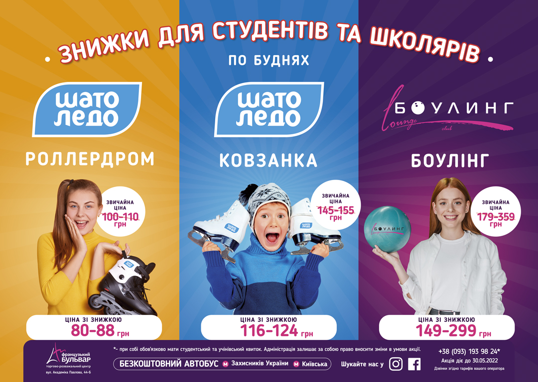 Знижка діє по буднях для школярів та студентів за наявності студентського квитка.